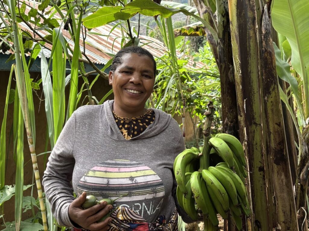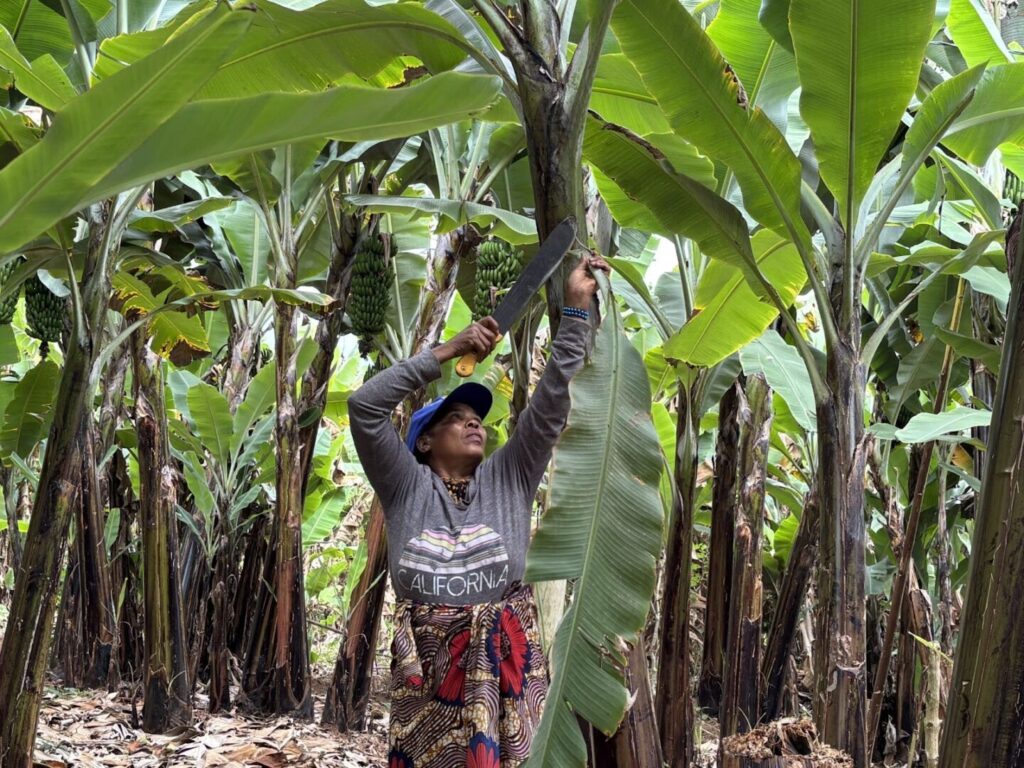 “After every harvest, I give one or two banana bunches to families who are struggling,” she says.