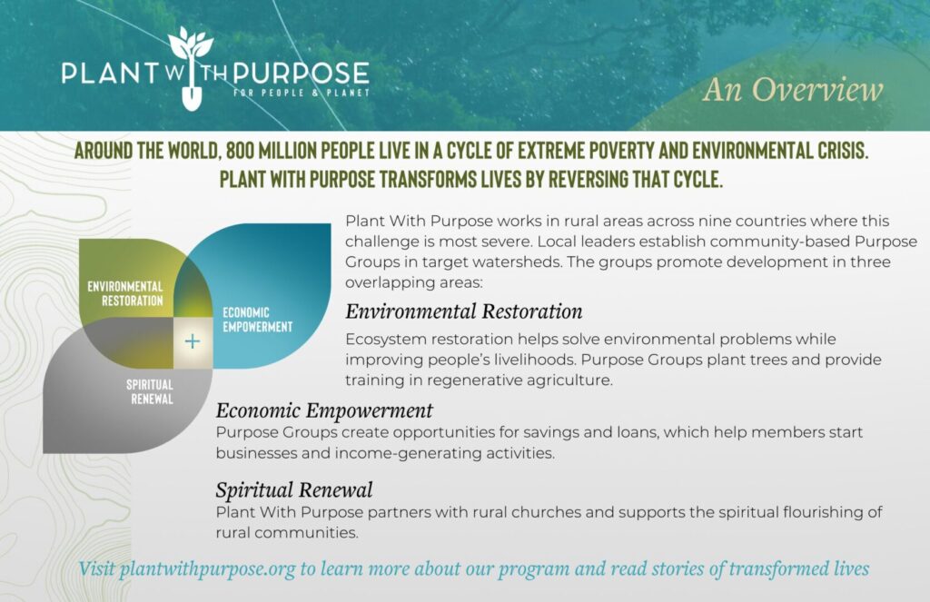 This is a downloadable flyer that offers an overview about how Plant With Purpose works. This is an ideal tool to hand out to guests at the experience who may have been unfamiliar with the organization and want to learn more.